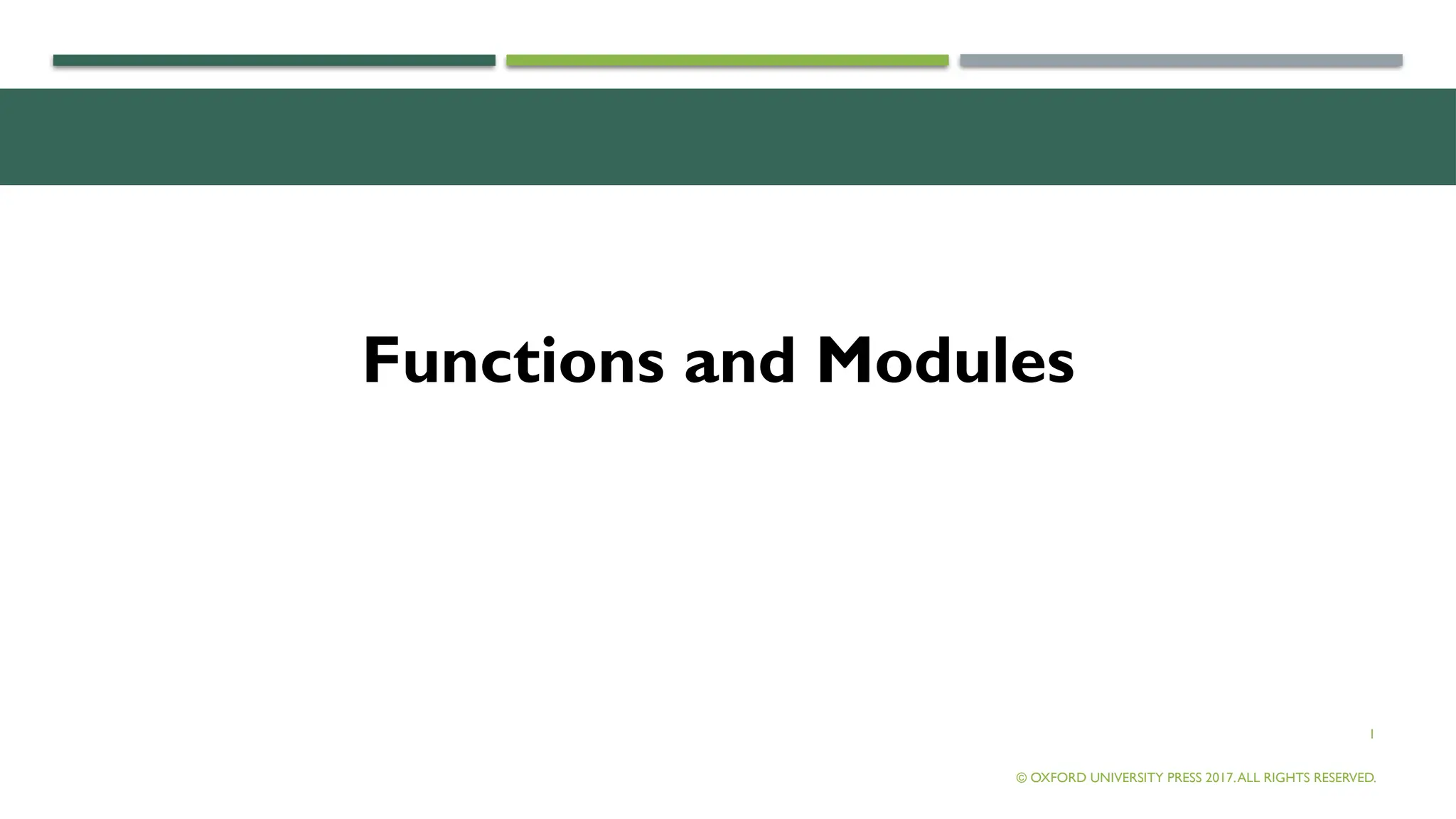 Modules Every Python program is a module, that is, every file that you save as .py extension is a module. © OXFORD UNIVERSITY PRESS 2017.ALL RIGHTS RESERVED. Examples: