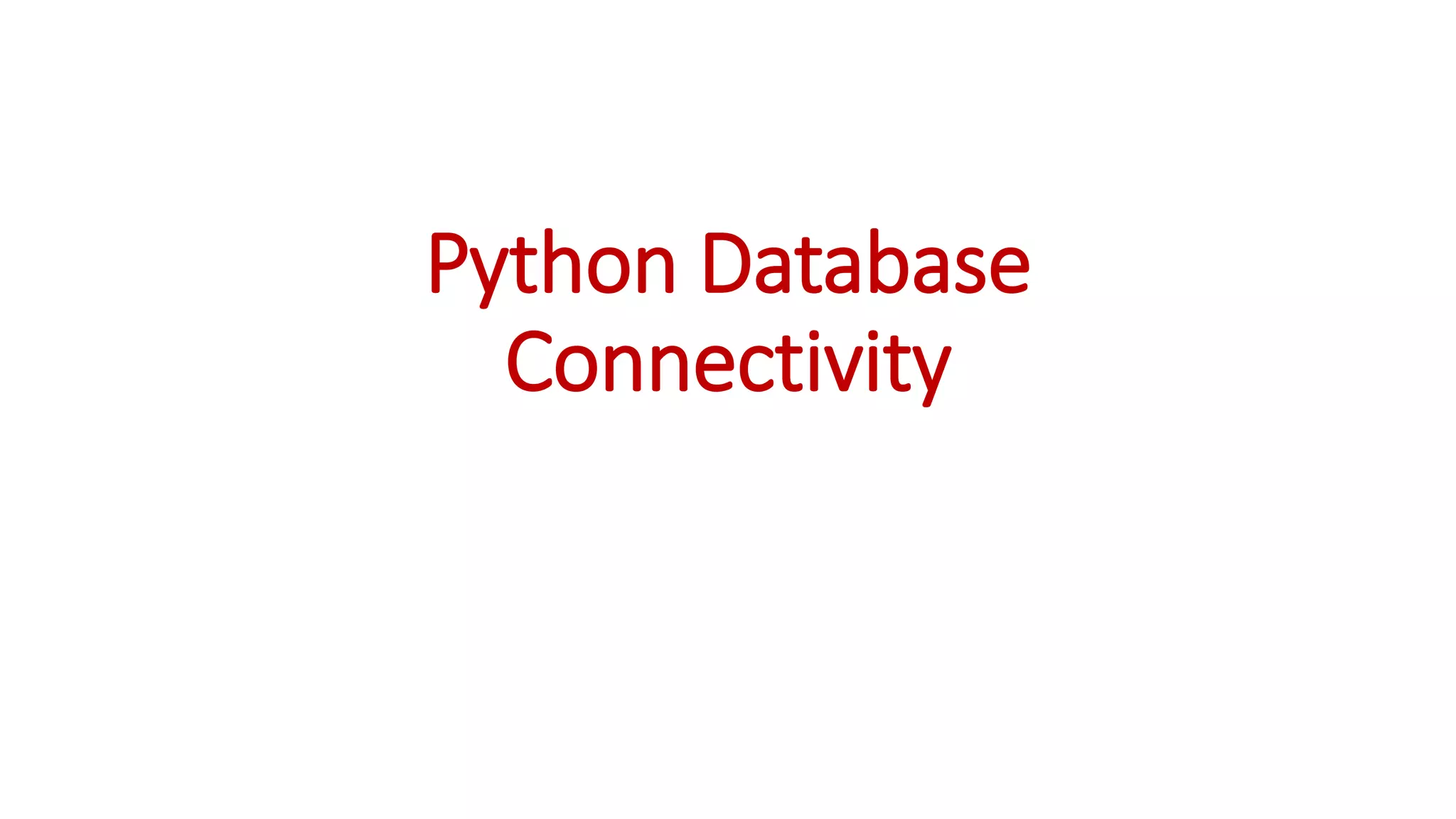 This document discusses connecting to and querying databases in Python. It outlines 7 steps to connect to a MySQL database: 1) start Python, 2) import database packages, 3) open a connection, 4) create a cursor, 5) execute queries, 6) extract data, and 7) clean up. It provides examples of connecting to MySQL and retrieving the first 3 rows from a student table.
