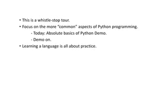 This document provides a high-level summary of an introduction to Python programming course. The summary includes an overview of Python basics like variables, data types, operators, conditionals, loops, functions and file handling. It also discusses commonly used Python libraries and concepts in data analytics like NumPy, Pandas, Matplotlib and statistics.