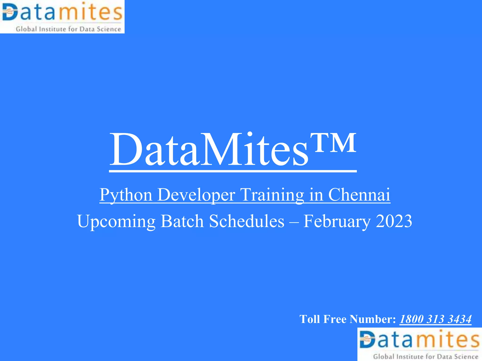Datamites is a leading data science training institute in Chennai offering a Python developer course starting in February 2023, with options for online and classroom training. The course includes foundational and advanced Python, dual certification, internships, and project-based learning, with fees of 36,000 rupees. Classes are available on both weekdays and weekends, with specific training dates provided.