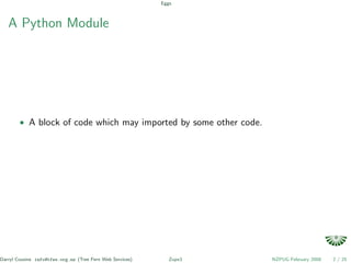The document discusses getting started with Python eggs, zc.buildout, and Zope3. It introduces eggs and packages, and how to create distributions with Distutils and Setuptools. It then covers using zc.buildout to configure and install Zope3 and related packages in a repeatable way. Finally, it provides an example of creating a simple "Hello World" application with Zope3.