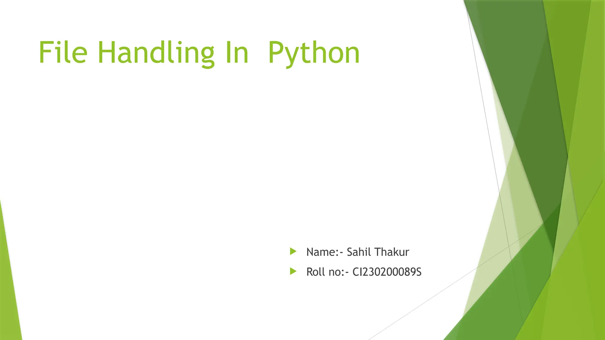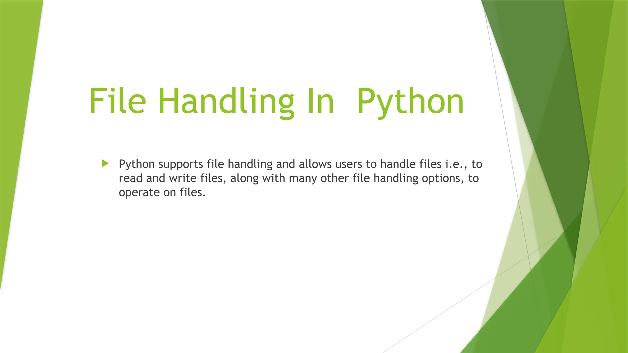 The document explains file handling in Python, detailing how to open, read, write, and append to files using various modes such as 'r', 'w', 'a', 'r+', and 'x'. It provides syntax examples for each mode and a brief demonstration of writing to a file using the write() function. Additionally, it highlights the importance of the close() command to free system resources.