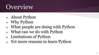 The document presents an overview of Python, highlighting its versatility, ease of use, and applications in various fields such as web development, data science, and automation. Key features include object-oriented programming, extensive libraries, and a supportive open-source community, despite its limitations in multithreading and low-level programming. It emphasizes why learning Python is beneficial, citing its readability and the efficiency it brings to developers.