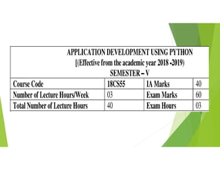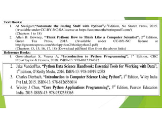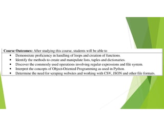 Python is a general-purpose programming language created by Guido van Rossum in 1991. It is dynamically typed and garbage collected, with code readability emphasized through significant whitespace. Python supports multiple programming paradigms including structured, object-oriented, and functional programming. Python 2.0 introduced features like list comprehensions and reference counting garbage collection, while Python 3.0 introduced backwards incompatible changes. Popular websites to learn Python include python.org, programiz.com, and w3schools.com. Common IDEs used for Python include Spyder, PyCharm, and Visual Studio Code, while Codecademy and DataCamp offer in-browser coding.