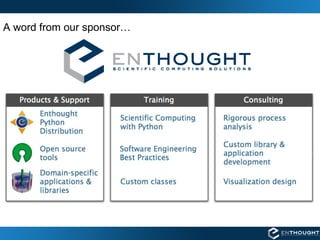 This document provides information about NumPy memory mapped arrays and Enthought Python Distribution (EPD). It discusses how memory mapped arrays allow large datasets to be accessed as NumPy arrays while residing in disk files rather than main memory. It also advertises EPD software and training courses for scientific computing in Python.