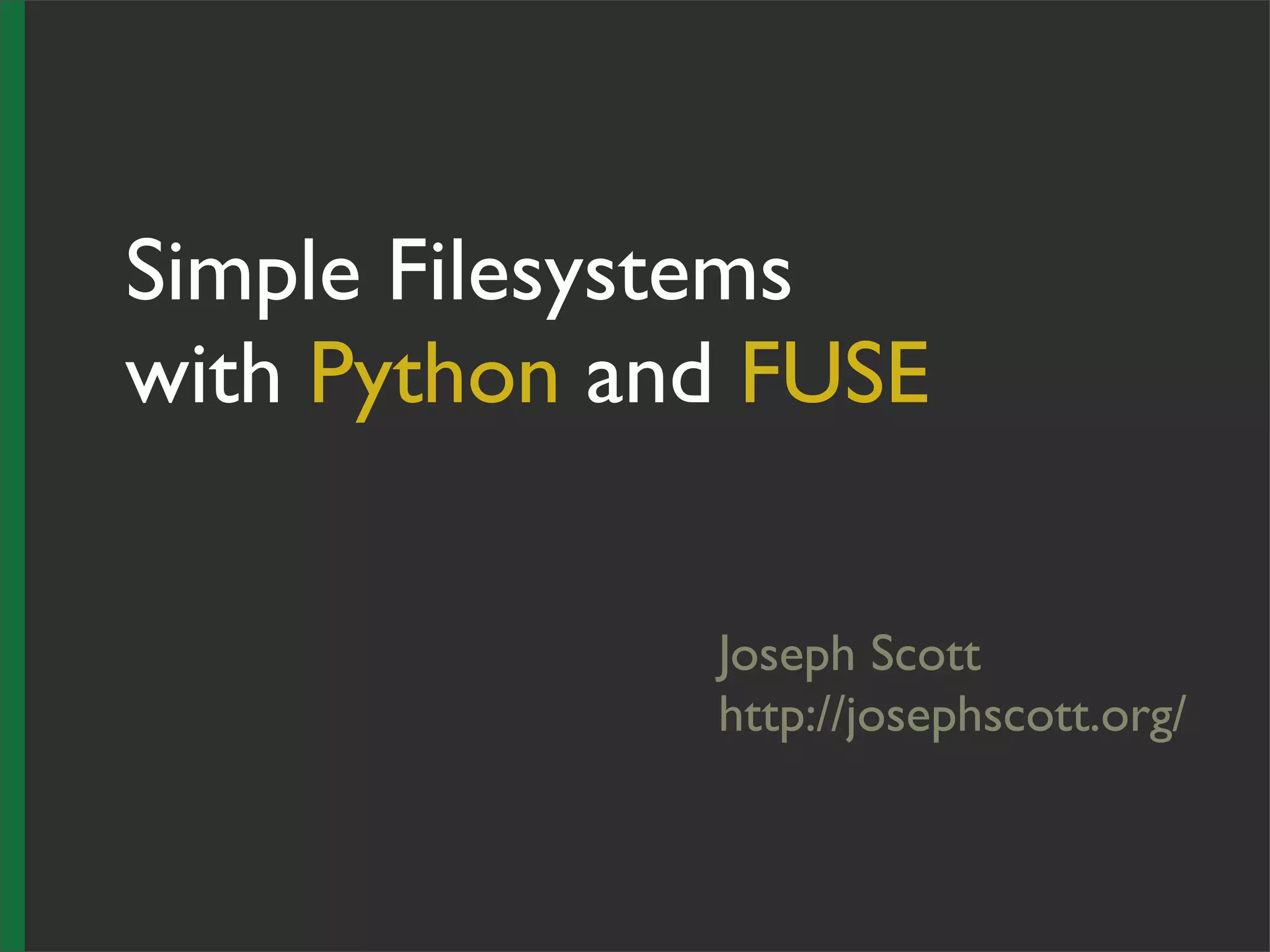 The document discusses using Python and FUSE (Filesystem in Userspace) to create simple filesystems. It provides examples of existing FUSE-based filesystems like redisfs and gmailfs. The FUSE API is outlined which Python can use to implement filesystem attributes and methods like getattr, rename, read, and write. The author's approach is to implement just the necessary methods for the task. Live examples are presented and questions from the audience are invited.