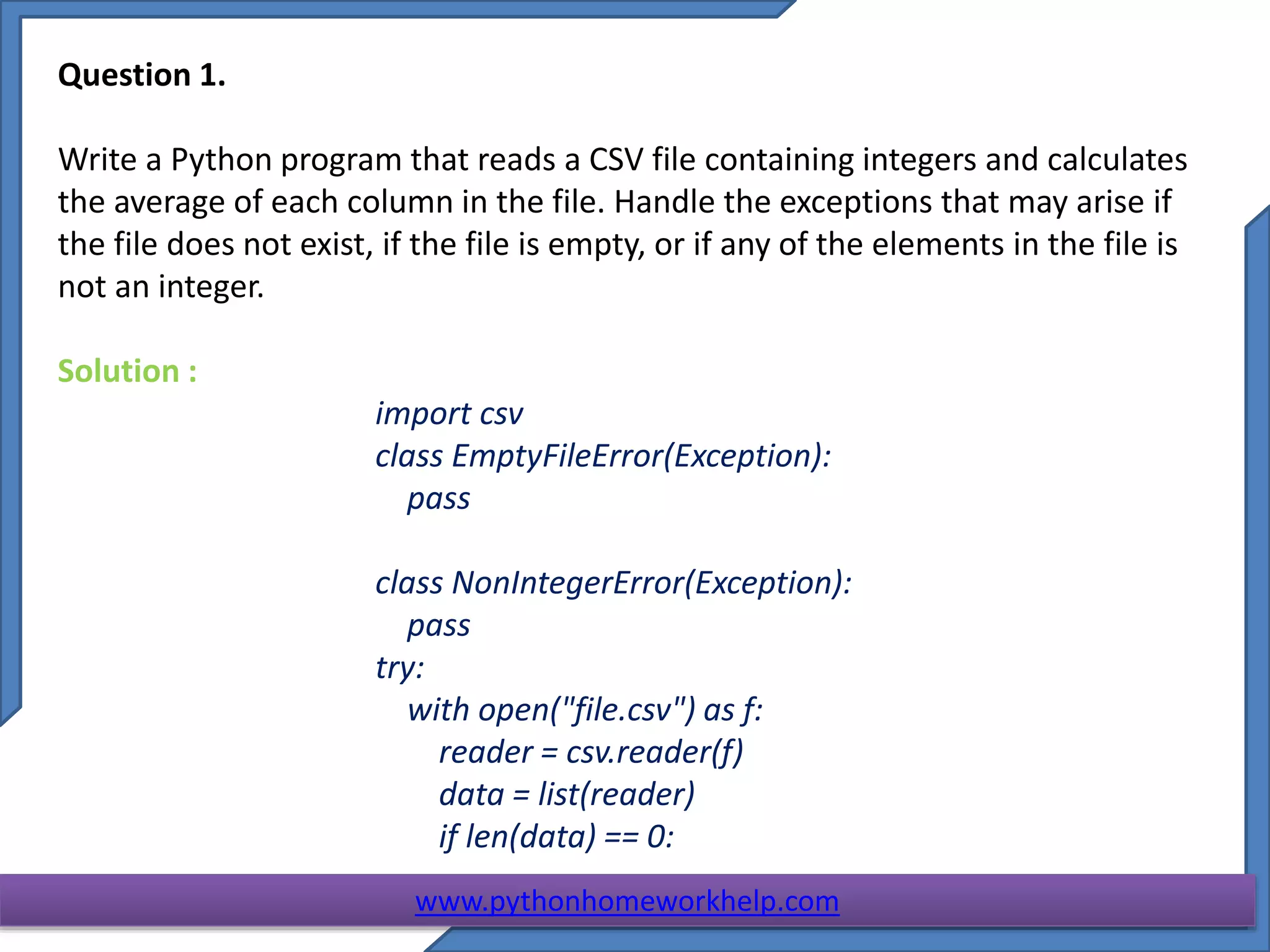 The document provides solutions to three questions involving exception handling in Python. It includes examples for calculating the average of columns from a CSV file, finding the average of a list of integers, and summing the rows of a text file, while handling potential exceptions like file not found, empty files, and non-integer values. Custom exceptions are defined, and error handling is demonstrated in each solution.
