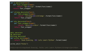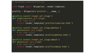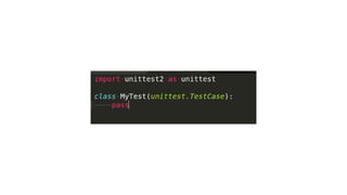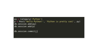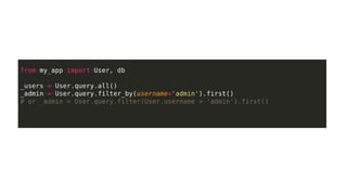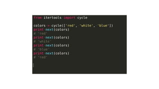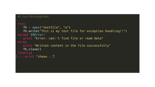 This document provides an overview of several advanced Python concepts including generators, iterators, decorators, exceptions handling, SQLAlchemy ORM, and unit testing. Generators allow creating iterators using the yield keyword to pause and resume function execution. Decorators dynamically alter function behavior. Exceptions handling uses try/catch blocks. SQLAlchemy is an ORM for Flask applications. Unit testing ensures code works as expected using libraries like unittest and nose.