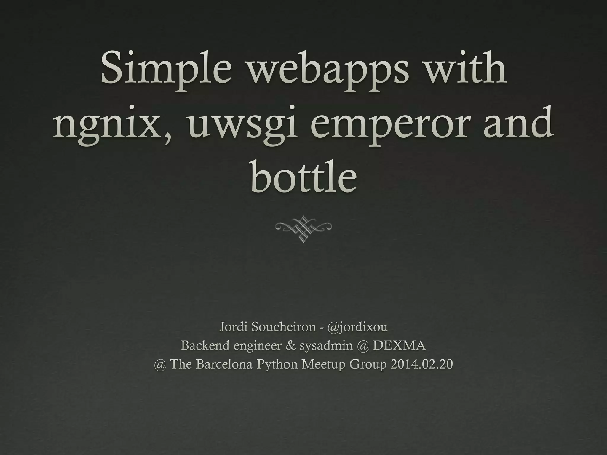 The document provides an overview of Nginx as a fast and easy-to-configure HTTP and reverse proxy server, alongside UWSGI as a flexible WSGI-compatible server. It describes how to create a simple application using the Bottle microframework and outlines installation steps for UWSGI with configuration examples for both UWSGI and Nginx. The document also includes brief explanations of their roles in application management and request handling.