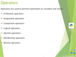The document outlines various types of operators in programming, including arithmetic, comparison, logical, identity, membership, and bitwise operators, providing examples for each. It also explains assignment statements, the print function for output, string formatting methods, the input function for user input, and the use of import statements for module inclusion. Overall, it serves as a comprehensive guide to fundamental programming constructs and operations.