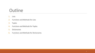This document provides an overview of lists, tuples, and dictionaries in Python. It discusses how lists can hold a sequence of objects of any type, while tuples are immutable lists. Functions for lists include len(), indexing, slicing, and methods like sort(). Tuples are created with parentheses and have similar functions as lists but are immutable. Dictionaries are like lists but use keys instead of indexes, allowing for more readable code when the key is a meaningful label like month names. Methods for dictionaries include indexing with [], adding/changing with []=, deleting with del, and copying with copy().