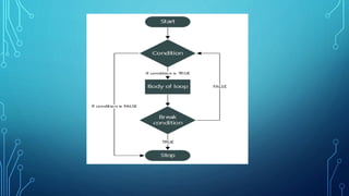 Loops allow blocks of code to be executed repeatedly. The two main types of loops in Python are for loops and while loops. For loops are used to iterate over an iterable object like a list or string, while while loops continue executing until a condition is no longer true. Loop control statements like continue, break, and pass can change the normal execution flow of loops. Nested loops involve having a loop inside the body of another loop.