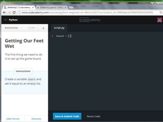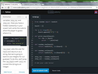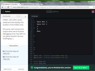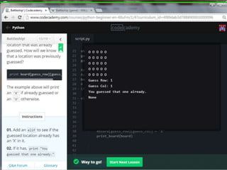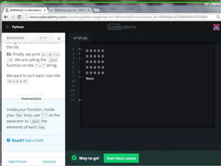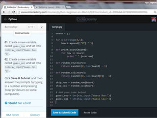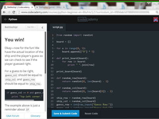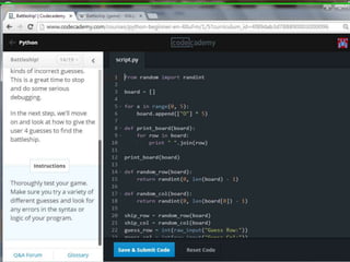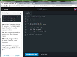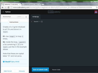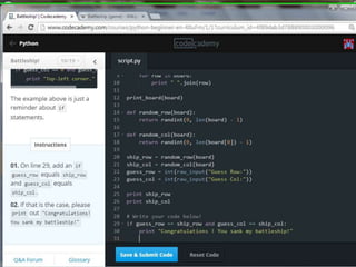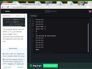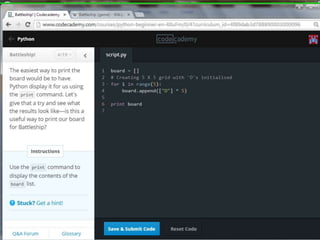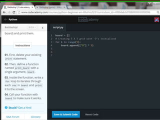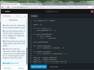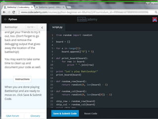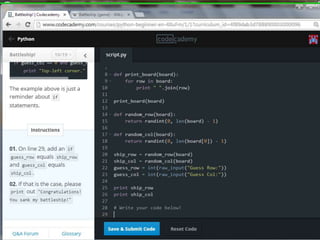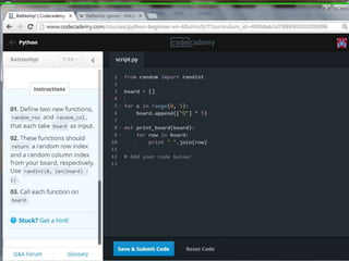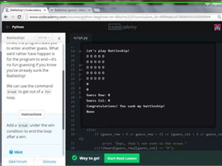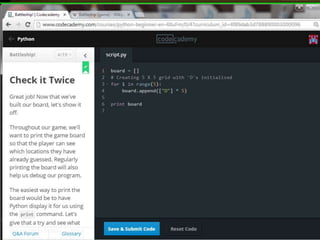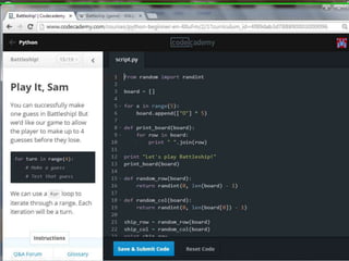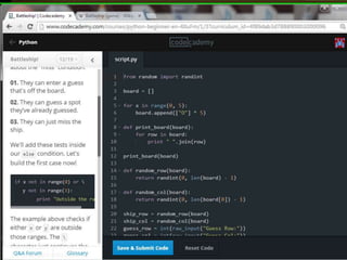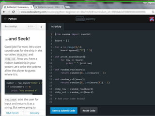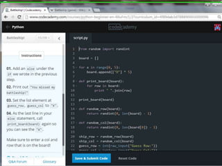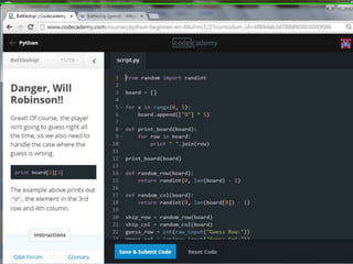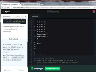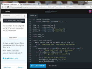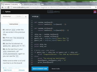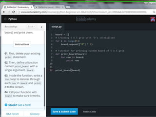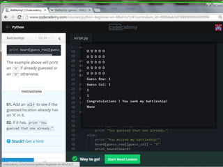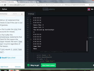 This document provides code for a Battleship game in Python. It uses lists, conditionals, and functions to generate a 5x5 board with a randomly placed ship, take user guesses for the ship's location, and check if the user hit or missed the ship. The code defines functions to print the board and generate random rows and columns. It then places a ship randomly, prompts the user for 4 guesses, checks each one, marks hits and misses on the board, and ends the game after 4 turns or if the user sinks the battleship.