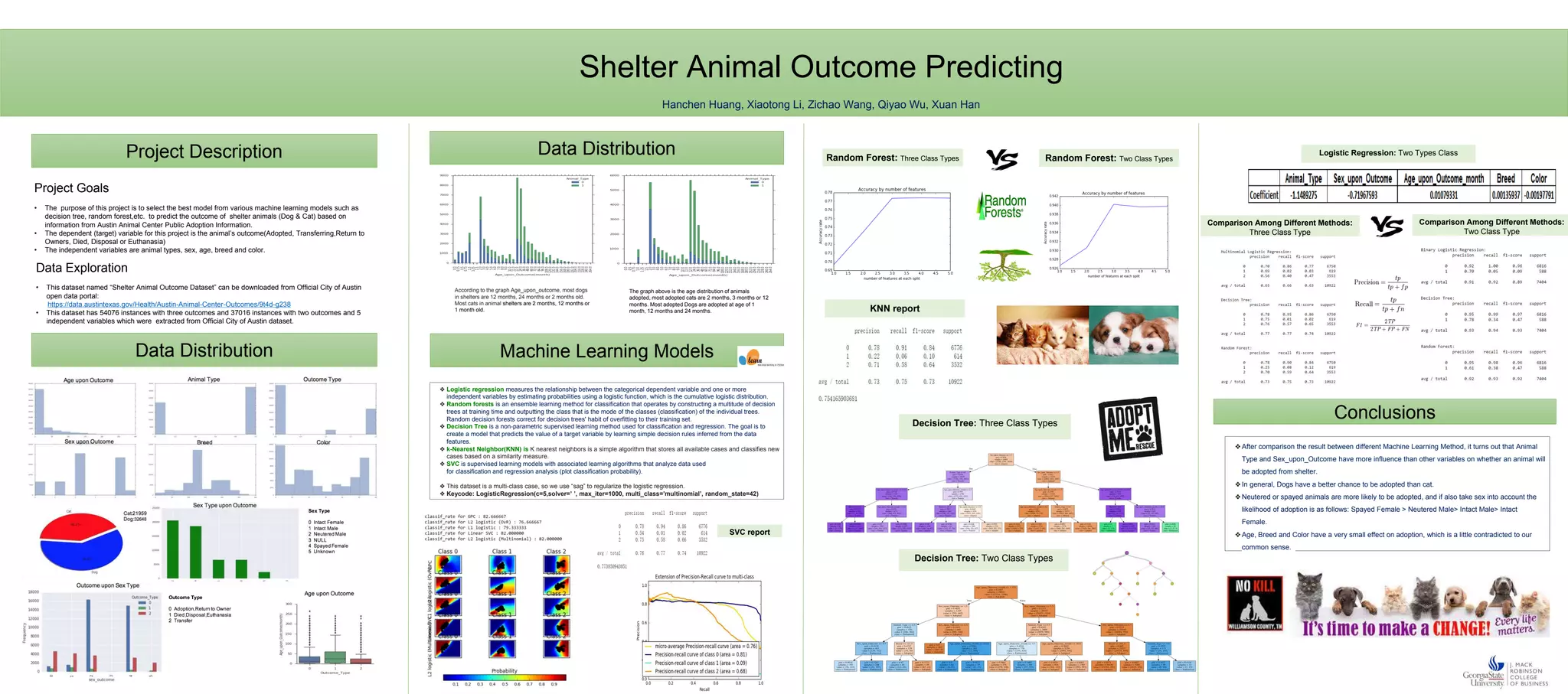 This project aims to predict shelter animal outcomes using machine learning models. The target variable is an animal's outcome (adopted, transferred, returned to owner, died, disposed, euthanized). Predictor variables include animal type, sex, age, breed, and color. Several models are tested on the Austin Animal Center dataset, including logistic regression, random forest, decision tree, KNN, and SVC. The results show animal type and sex have more influence on adoption outcomes than other variables. Dogs have a better chance of adoption than cats. Spayed/neutered animals are more likely to be adopted, especially spayed females and neutered males. Age, breed and color have little effect, contradicting common