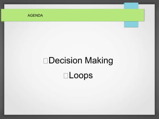 This document discusses decision making and loops in Python. It covers IF, IF/ELSE, and nested IF statements for decision making. For loops, it discusses while and for loops, providing an example of a while loop. It also covers loop control statements like break, continue, and pass and provides examples of how each works.