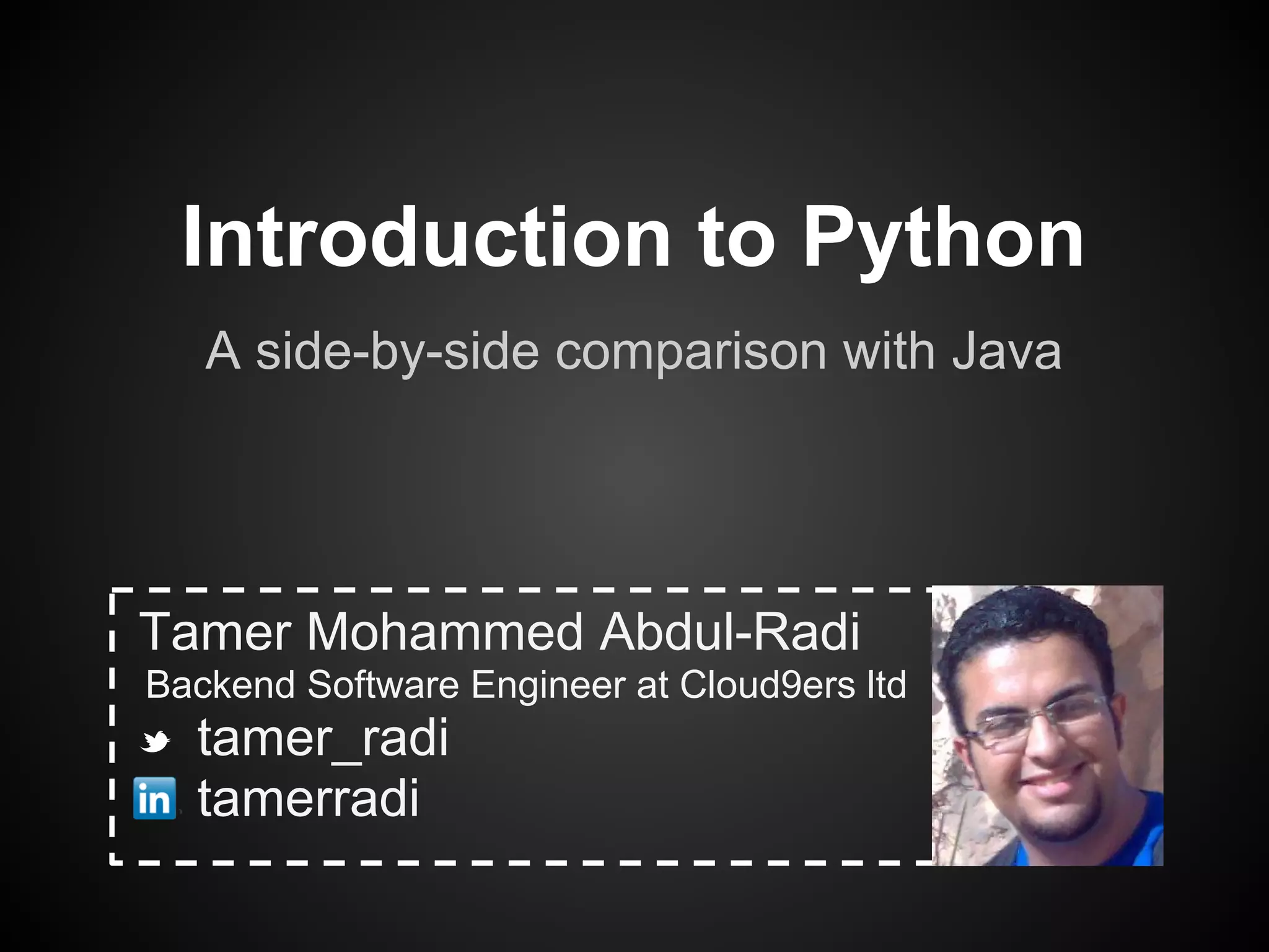 The document provides a side-by-side comparison of Python and Java, highlighting key features and differences in syntax and functionality. It covers various programming constructs such as lists, arrays, hashtables, and classes, as well as Python's special features like introspection and enhanced data structures. Additionally, it discusses the strengths and weaknesses of Python in different applications, including string processing and operating system interfaces.