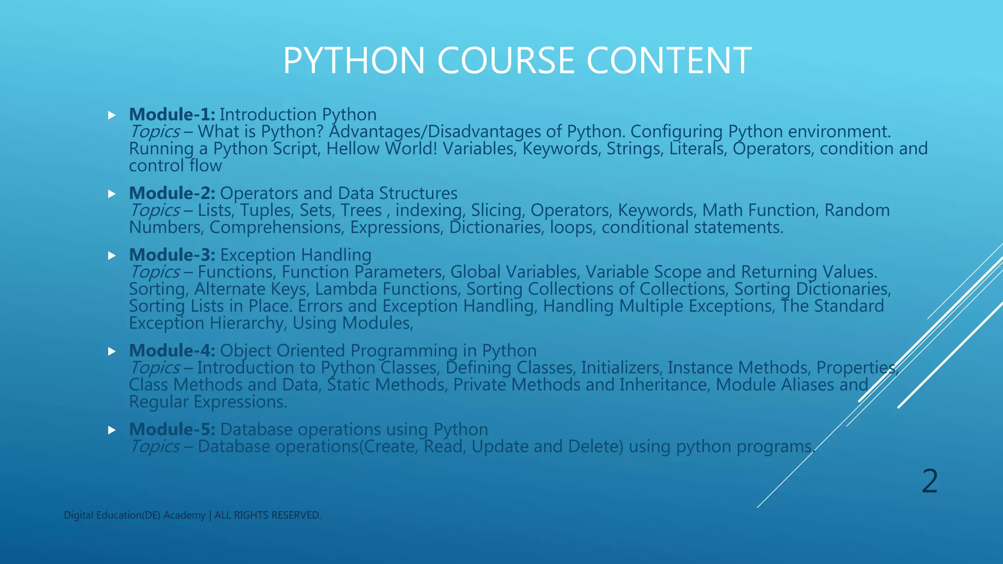 The Python training document outlines a 5 module course covering fundamental Python concepts. Module 1 introduces Python basics like variables, strings, and control flow. Module 2 focuses on data structures like lists, tuples, sets, and dictionaries as well as operators and math functions. Module 3 covers functions, scopes, sorting, and exception handling. Module 4 introduces object-oriented programming in Python with classes, methods, and inheritance. Module 5 teaches database operations using Python programs for create, read, update and delete functions. Students can contact the Digital Education Academy for more details on the Python course.