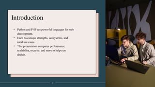 In this comprehensive presentation, explore a detailed comparison between Python and PHP, two of the most widely used programming languages in modern web development. Learn how each language performs in terms of scalability, security, integration, cost, and hosting support. Whether you're a developer, startup founder, or enterprise decision-maker, this guide will help you choose the right technology for your next project.