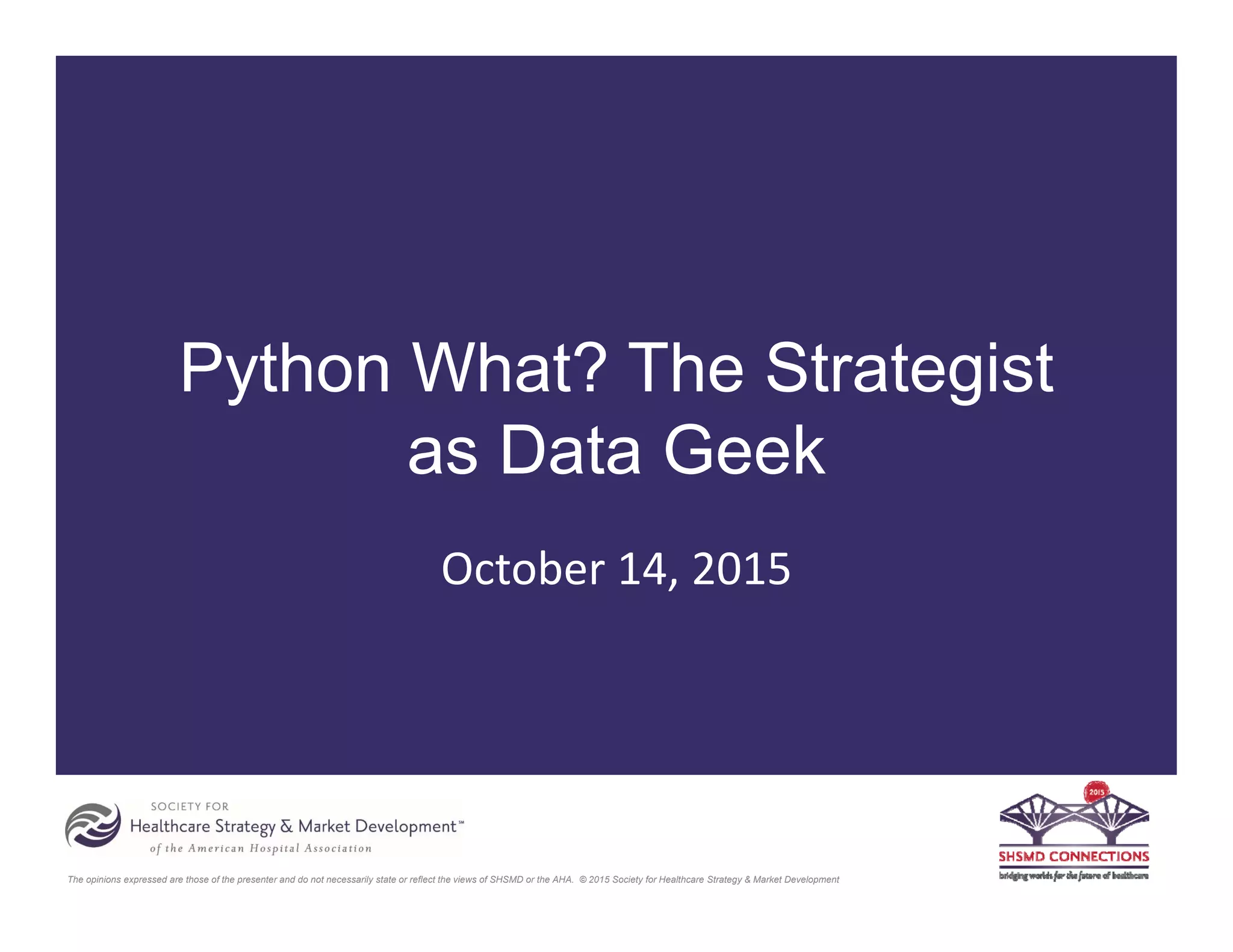 The document discusses the role and importance of analysts in healthcare strategy, focusing on their skills, tools, and responsibilities in data analysis and decision-making processes. It highlights the need for analysts to convert data into actionable information, support strategic planning, and utilize various analytical tools, including Python and machine learning. Additionally, it includes insights from a case study on optimizing physician referrals through data utilization.