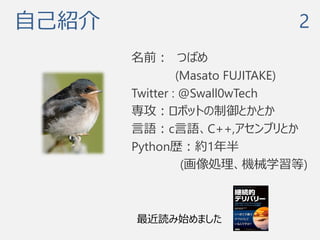 : @Swall0wTech 専攻:ロボットの制御とかとか 言語:c言語、C++,アセンブリとか Python歴:約1年半 (画像処理、機械学習等) 最近読み始めました