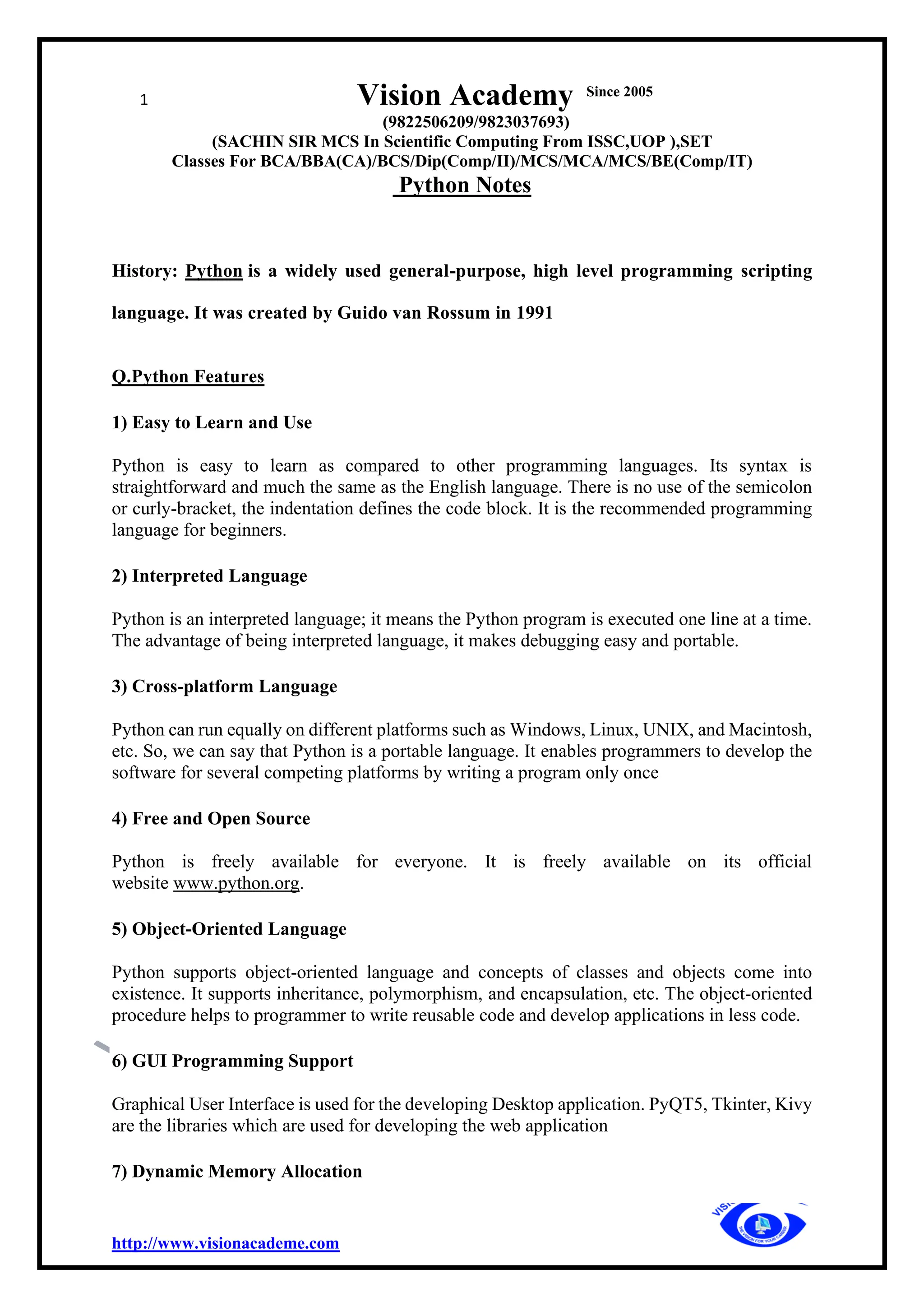 The document outlines the features, applications, and disadvantages of Python programming language, established in 1991 by Guido van Rossum. It highlights Python's ease of learning, portability, object-oriented capabilities, and diverse use cases such as web and software development, scientific computing, and multimedia applications. Additionally, it discusses drawbacks like slower execution speed, memory inefficiency, and challenges in mobile computing.