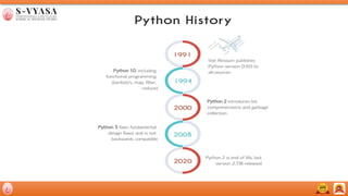 The document provides an introduction to Python, highlighting its high-level, interpreted nature, versatility across applications like web development and data science, and extensive community support. It discusses Python's history, basic syntax, data types, and includes examples of operations and exercises to enhance learning. The comparison of interpreters and compilers is also covered, emphasizing the advantages and disadvantages of Python's interpreted execution model.