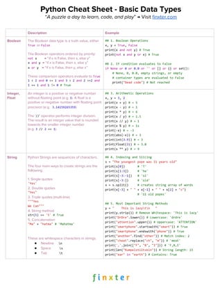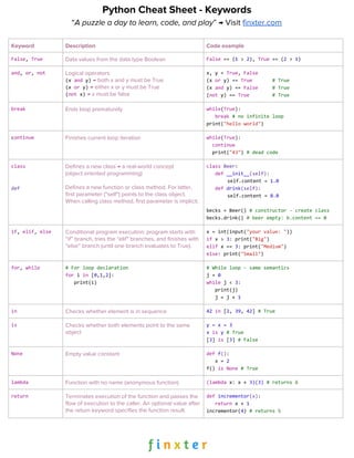 This document provides a cheat sheet on Python keywords and basic data types. It lists common Python keywords like False, True, and, or, not, break, continue, class, def, if, else, for, while, in, is, None, lambda, and return along with code examples. It also covers basic data types like Boolean, integer, float, string, list, set, dictionary, and complex data types like classes. It provides examples of using lists, sets, dictionaries, classes and functions in Python.