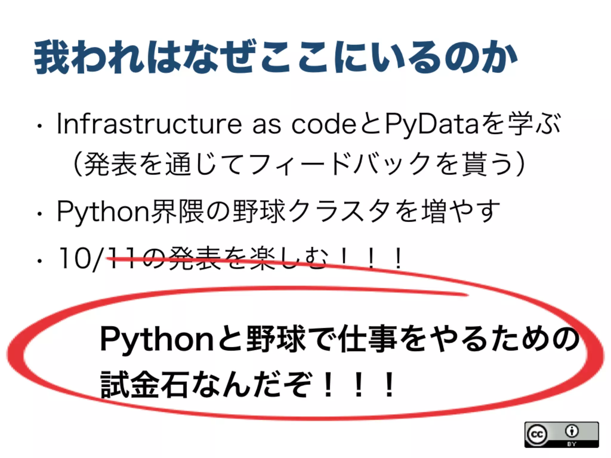 まとめ • 価値を創るプロセスはカンファレンス/勉強会でも有効 聴衆の皆さま、自分にとっての価値は何か? をプロセスを駆使して解くといいよ! • Pythonが好き・野球が好き、だけでは価値は創れない! まずは想いを絵にして自問自答 絵はインセプションデッキでも何でもいい(Lean