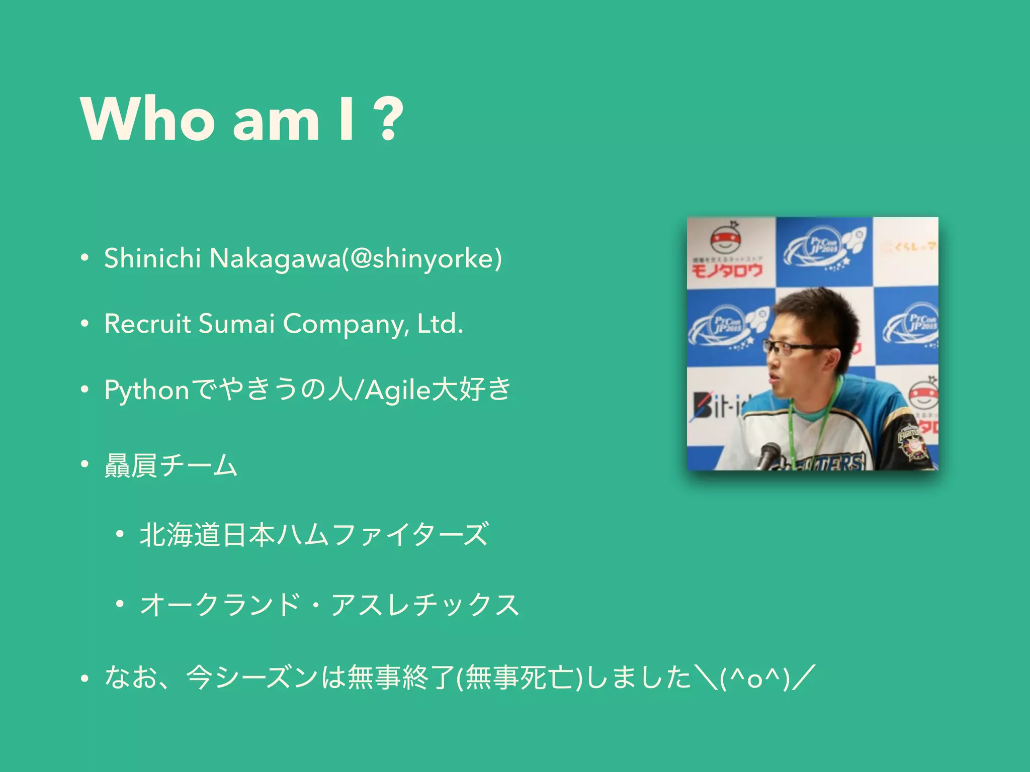 ? • Shinichi Nakagawa(@shinyorke) • Recruit Sumai Company, Ltd. • Pythonでやきうの人/Agile大好き • 贔屓チーム • 北海道日本ハムファイターズ • オークランド・アスレチックス • なお、今シーズンは無事終了(無事死亡)しました\(^o^)/