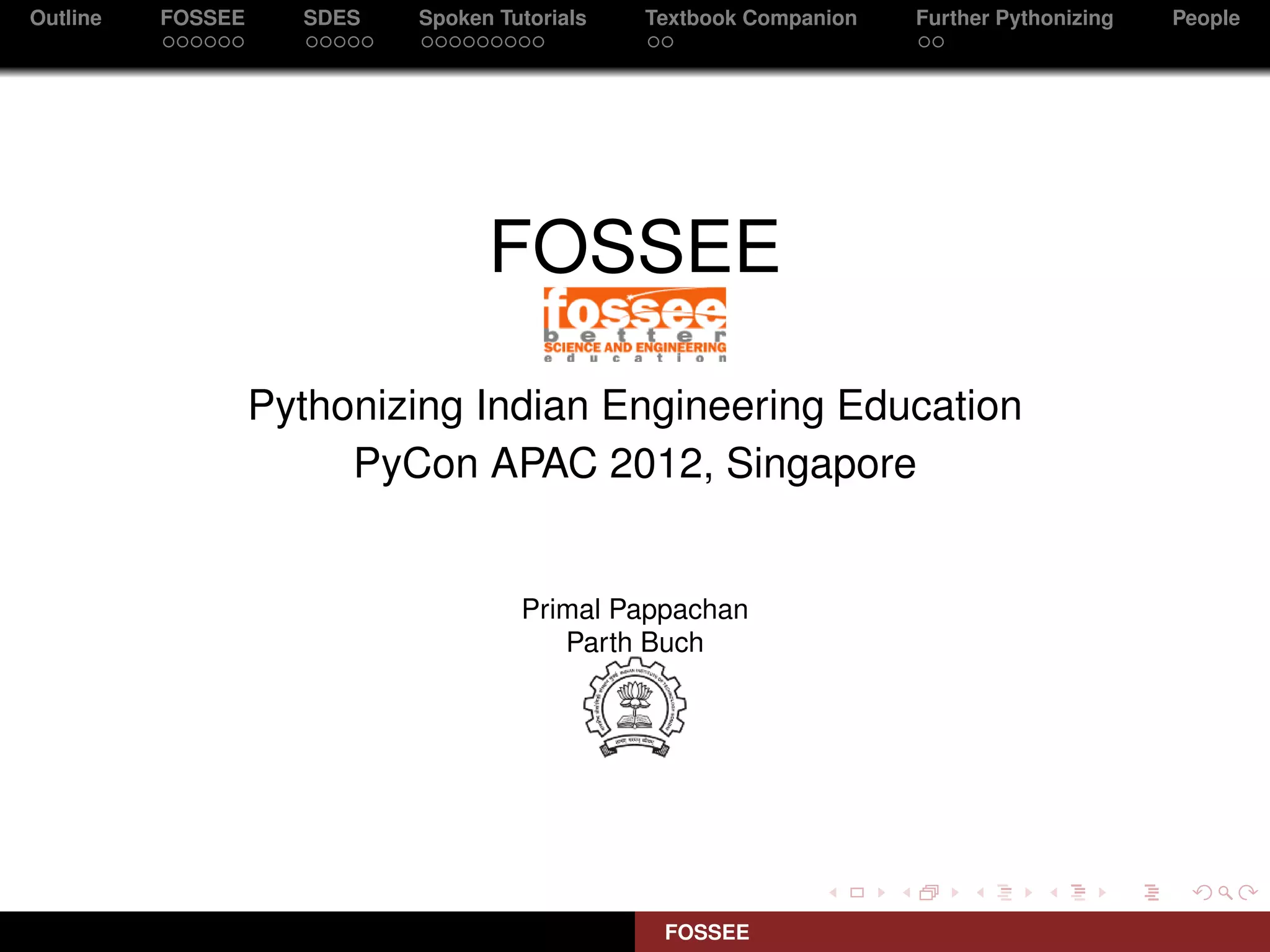 The document outlines the work of FOSSEE (Free/Libre and Open Source Software for Education) in promoting open source software and Python in Indian engineering education. It discusses FOSSEE's SDES course, Spoken Tutorials project, Textbook Companion project, and efforts to build a Python community through events. FOSSEE works with academics to introduce open source tools into curriculums and create self-learning resources to improve access and quality of education.
