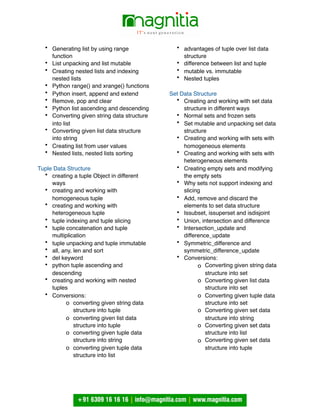 The document provides a comprehensive overview of programming languages and focuses on Python, including its features, history, and real-time applications. It covers various topics such as data structures, functions, object-oriented programming concepts, exception handling, file handling, and database management. Additionally, it addresses advanced topics like multithreading, networking, and GUI programming, emphasizing logical thinking and problem-solving skills.
