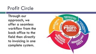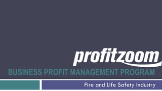 The document describes a business profit management program called ProfitZoom that is designed for the fire and life safety industry. It provides a seamless workflow from the back office to technicians in the field to invoicing. Key features include a dashboard with critical business information, customer navigation to see all details and work sites, order entry pre-populated with worksite data, dispatching and routing of technicians, and a mobile app for technicians to enter work details and sales. The program aims to provide superior customer service and a competitive advantage while decreasing customer calls and costs.