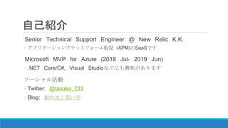 Engineer @ New Relic K.K. ◦ アプリケーションプラットフォーム監視(APM)のSaaSです Microsoft MVP for Azure (2018 Jul- 2019 Jun) ◦ .NET Core/C#, Visual Studioなどにも興味があります ソーシャル活動 ◦ Twitter: @tanaka_733 ◦ Blog: 銀の光と碧い空