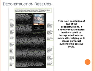 The document discusses how the researchers addressed their target audience when creating a movie clip. They conducted a questionnaire that asked the audience about their preferences in action movies. They found the audience preferred the movie "Taken" and researched its popular features. They then incorporated those features from "Taken" and other audience preferences into their own movie clip to best appeal to their target audience.