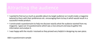 The document discusses how the author attracted their target audience for a magazine. They conducted a questionnaire of 15 people to understand what the audience wanted. Most wanted a music group featured. The author created a fictional girl band called Belle Amie to appeal to younger girls. Photos on the cover and in the magazine were chosen to match the audience preferences and themes revealed in the questionnaire. The tone of the magazine was informal to connect with readers as equals interested in pop music news.