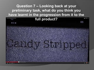 The document discusses the progression of skills from the preliminary task to the full production. Key skills that improved include camera techniques like tilting and angle usage. Lighting and sound design were also stronger in the final production. Props, actor performance, and editing skills like using blade tool in Final Cut progressed. Organization and ensuring professionalism on set was learned. Overall, many technical and planning aspects strengthened from lessons of the preliminary task.