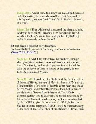 The document discusses reconciling differences between the genealogies of Jesus in the gospels of Matthew and Luke. It explains that while Matthew traces Jesus' lineage through Joseph, Luke traces it through Mary, as Joseph was considered Heli's son-in-law. This was important to establish Jesus' right to the throne of David. It also addresses how the curse on the line of King Jeconiah did not affect Jesus' claim, as he was not Joseph's biological son.