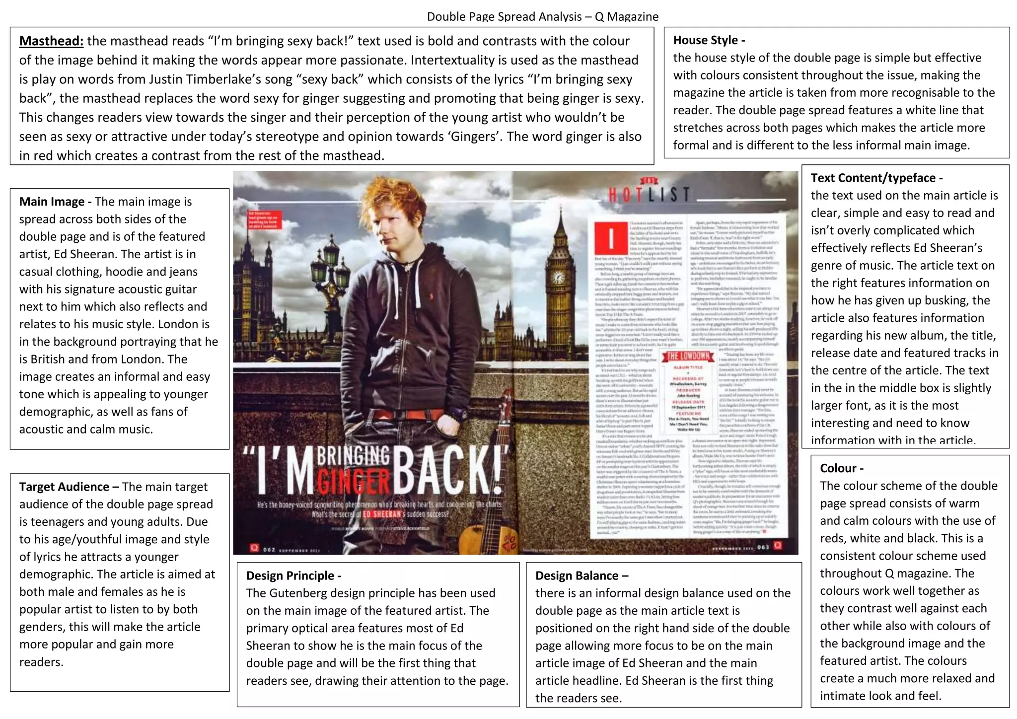 The masthead plays on the lyrics of Justin Timberlake's song "Sexy Back" by replacing "sexy" with "ginger", promoting that being ginger can be seen as sexy. The main image spans both pages and features Ed Sheeran casually dressed with his guitar, reflecting his style. The target audience is teenagers and young adults due to his youthful image and acoustic music. Warm colors like red, white, and black are used consistently and create a relaxed feel. The article is positioned to put more focus on the large main image of Ed Sheeran.
