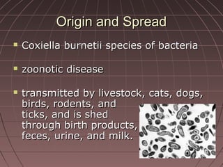 Q fever is a zoonotic disease caused by the bacteria Coxiella burnetii, which is typically transmitted through contact with livestock, cats, dogs, birds, rodents, or ticks. It has an incubation period of around 20 days and can cause acute symptoms like fever, cough, and breathing difficulties, or develop into chronic Q fever which affects the heart, blood vessels, and bones. Treatment involves a combination of antibiotics like doxycycline and hydroxychloroquine. The disease is considered very infectious and a potential bioterrorism agent.