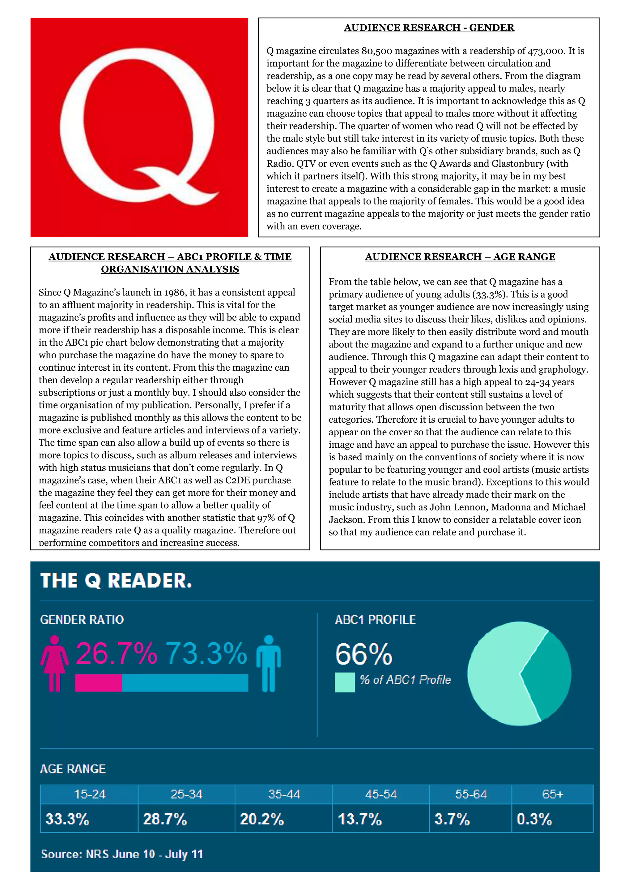 Q magazine has a majority male readership of nearly 3/4. While the topics appeal more to males, the 1/4 of female readers are not negatively affected. There is an opportunity to create a new music magazine that has majority female appeal, as no current magazine meets this gender ratio. The primary audience of Q is young adults ages 33.3%, which is a good target market. Q also has high appeal to ages 24-34, showing mature content. Featuring younger artists on the cover can help relate to this audience.