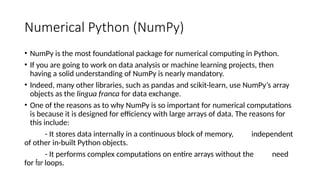 The document provides an overview of data analysis and visualization using Python, focusing on the importance of libraries like NumPy and Pandas for numerical computing and data manipulation. It covers key concepts such as creating and operating on numpy arrays, using pandas for data frames, and performs exploratory data analysis (EDA) with visualizations, including histograms and seaborn enhancements. Additionally, it discusses techniques for data wrangling and visualizing distributions and relationships within datasets.