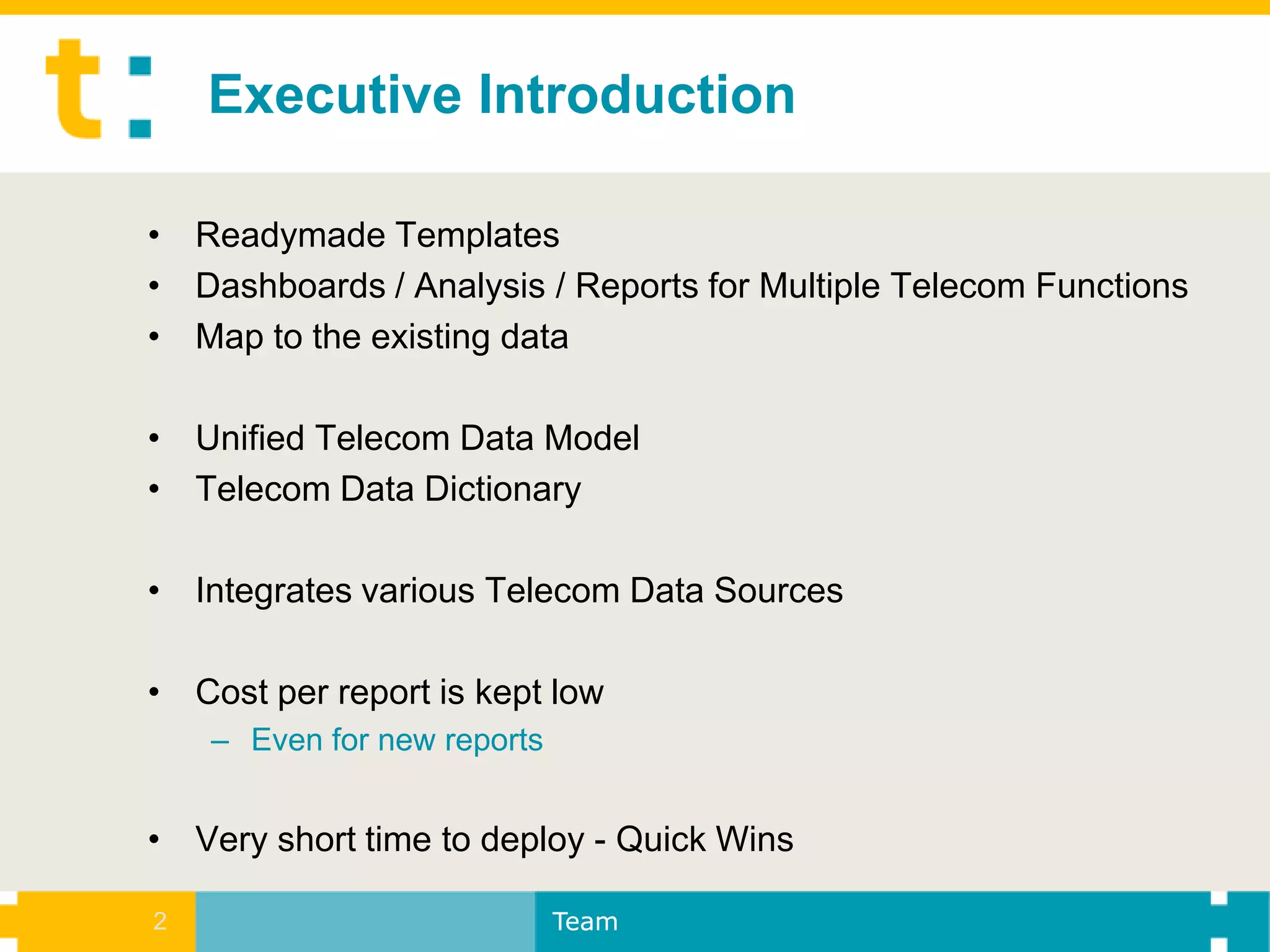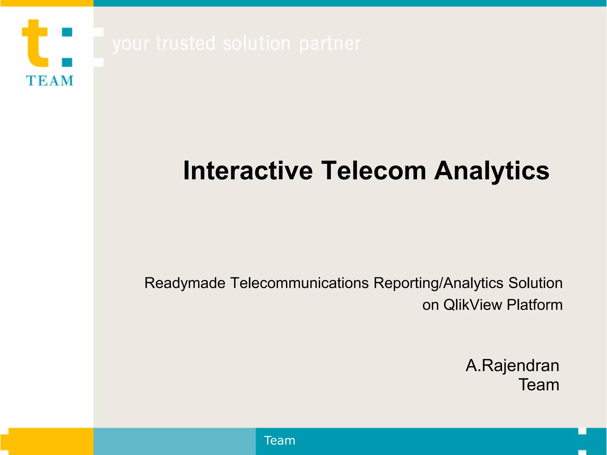 This document introduces an interactive telecom analytics solution built on the QlikView platform. It provides ready-made templates, dashboards, reports, and a unified telecom data model to integrate various telecom data sources. The solution aims to address common telecom business information needs such as analyzing customer behavior, maximizing revenue, and improving the timeliness and accuracy of insights. It offers a low-cost reporting solution that can deploy quickly using a pre-defined telecom framework and data model. The architecture is designed for scalability, reliability, and ease of use for both business users and administrators.