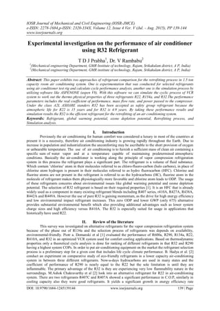 The document summarizes an experimental investigation on the performance of an air conditioner using R32 refrigerant. It begins with an abstract describing the refrigerant comparison experiment conducted on a 1.5 ton capacity air conditioning system using R22, R134a, and R32. Performance parameters like coefficient of performance, mass flow rate, and power to the compressor were calculated. The results and simulations showed R32 to be the most efficient refrigerant for retrofitting air conditioning systems due to its lower global warming potential and atmospheric lifetime compared to R22.