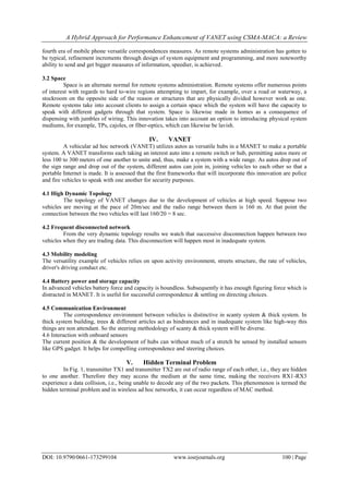 This document provides a review of approaches for enhancing the performance of vehicular ad hoc networks (VANETs) using CSMA-MACA. It begins with an introduction to VANETs and discusses some of their key properties including high dynamic topology, frequent disconnections, and the hidden terminal problem. The document then reviews related work on hybrid approaches combining CSMA and MACA for routing in VANETs. Finally, it provides details on commonly used routing protocols like AODV and discusses how accounting for obstacles in simulations can improve safety performance evaluations of VANET applications.