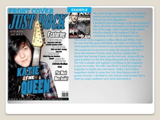 This document summarizes how the media product uses and develops conventions of real magazines. It discusses design elements like the front cover layout with image on side, masthead font, and use of photos on contents page. Headline styles and language are kept informal to match the target audience. Color schemes and layouts are consistent between pages to create familiarity for readers. While some conventions are followed from other magazines, the focus is on simplicity and accessibility to attract and engage readers.