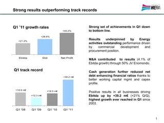 Hera Group reported strong Q1 2011 results that outperformed previous records. EBITDA grew 21% compared to Q1 2010, driven by outstanding performance in energy activities from commercial development and procurement. M&A also contributed to growth. Positive results across all business areas led to higher profits and cash flows that reduced net debt and strengthened financial ratios.