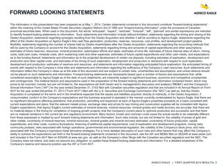 Agnico Eagle reported record quarterly gold production of 366,421 ounces with total cash costs of $537 per ounce in Q1 2014. Production was particularly strong at Meadowbank, with 156,444 ounces produced at a total cash cost of $434 per ounce. Agnico Eagle expects to exceed its 2014 production guidance of 1.205 million ounces and remain below the lower end of its cash cost forecast of $670 per ounce. The company also announced a joint acquisition with Yamana Gold of Osisko Mining Corporation on April 16, 2014.