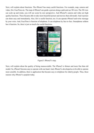 The document summarizes the key features and awards of the iPhone 5 smartphone. It discusses the iPhone 5's superior performance including its high resolution Retina display, powerful and efficient A6 chip, and long-lasting battery life. It also highlights the iPhone 5's thinner and lighter physical design while maintaining faster speeds and better functions. Key functions mentioned include its high-quality camera, FaceTime video calling, map features, and voice assistant Siri. Finally, it notes the iPhone 5 is more maneuverable and easy to operate with one hand due to its refined design.