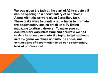 We were tasked with creating a 5 minute documentary opening on a chosen topic, as well as a radio trailer and magazine article to promote it. Extensive research was conducted into the topic, audience, and documentary genres and conventions. The documentary argues whether being gay is innate or learned, matching the expository mode of presenting arguments and addressing the viewer directly. Various techniques were used effectively, such as establishing shots, interviews following rules of thirds, close-ups during voiceovers, and archive footage in a montage to introduce the topic. Reconstructions were also used innovatively. The documentary follows conventions while challenging some, such as using dramatizations.