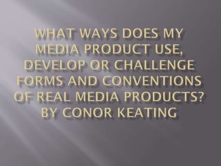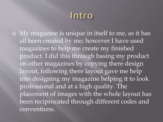 The document discusses the design choices made for a student-created magazine. It describes placing the title in the top left corner as most magazines do. An attention-grabbing font was used for the title. The front cover image depicts a rapper holding a microphone to emphasize their musical career. Color scheme, coverlines, and other design elements were chosen based on research of popular rap magazines. For the contents page, the student followed some conventions but also made some changes, such as including more images than typical. The double-page spread uses conventions like a drop cap but also makes unique design choices like placing the artist's initial behind the text.